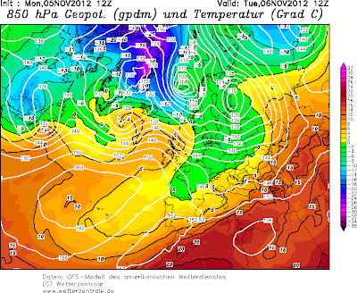 Por la mañana tendremos un flujo de viento de componente Oeste, y por lo tanto poca ola se formará en Barcelona. Si observamos el siguiente mapa, podemos observar como las alturas geopotenciales (línias blancas, altura a la que encontramos una misma presión atmosférica) están muy separadas, y posicionadas perfectamente para la entrada de "viento de Tramuntana" (N) al norte, y "viento de mestral" (NW) al sur.